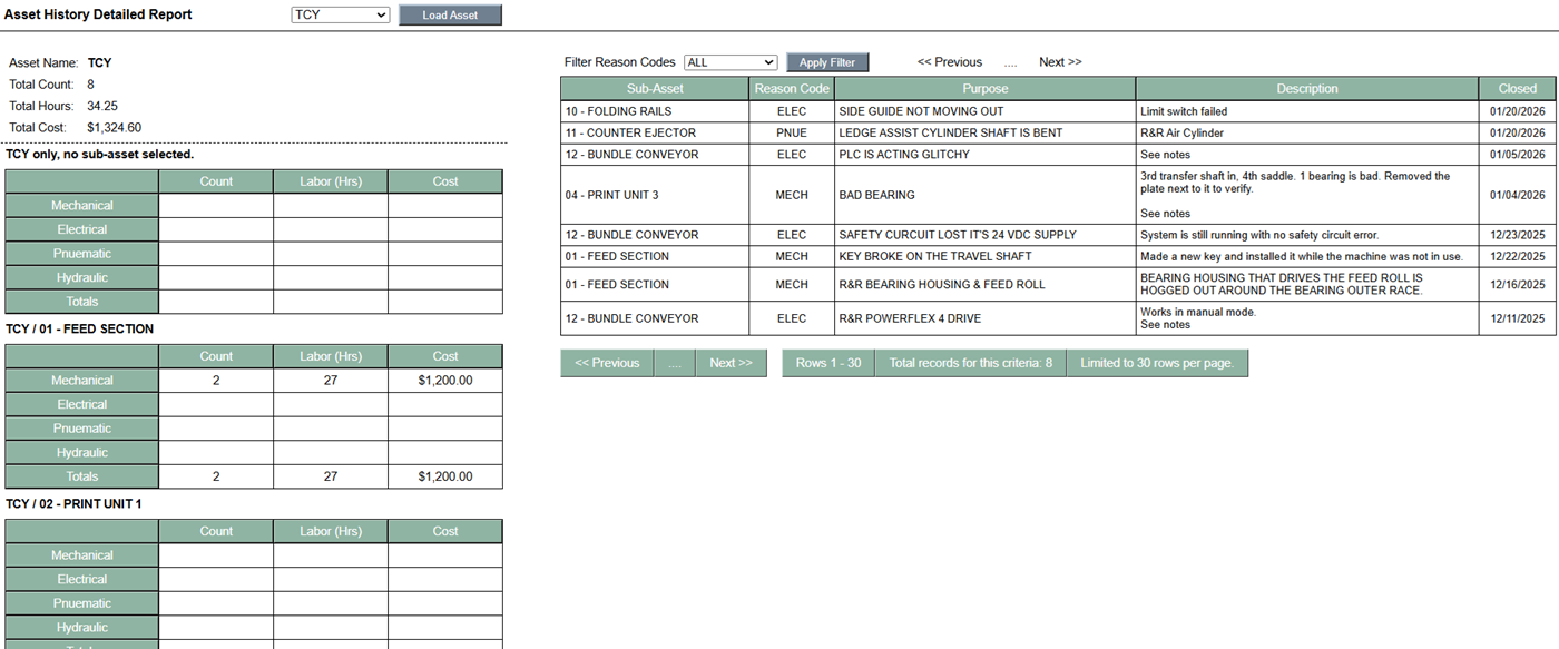 | This report breaks down the asset to its sub-asset level and shows what sub-assets are having issues and what kind of issues. To the right is the actual work orders that generated the data. With this report, you can focus on where the real issues are and determine what is needed to get all sub-assets to be more reliable. This reports also helps to determine what spare parts you may want on hand by its reason codes. |