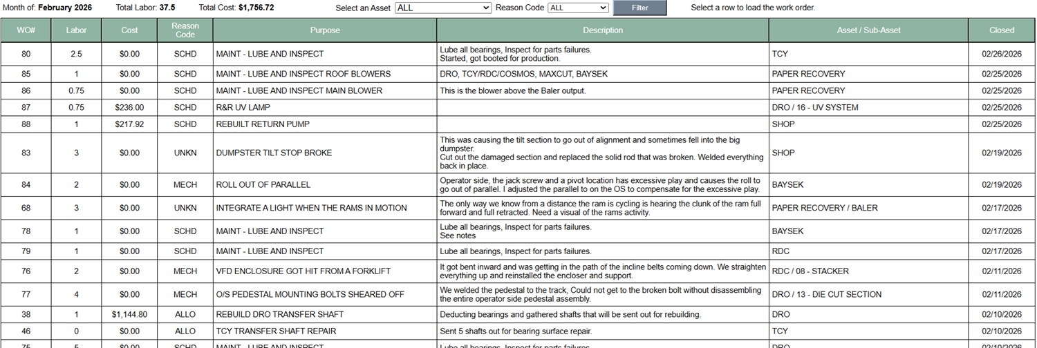Accessing this report from the dashboard, this report lists all work orders for a selected month. Allows you to see all activity whether it is an issue or a preventive maintenance activity.