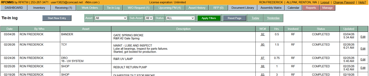The purpose of this area is for communication between shifts or recording activity performed. You can enter general activity so you can look back when something has been done or capture activity related to a work order.