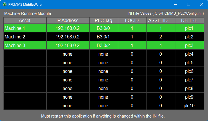 | Currently, RFCMMS MiddleWare is designed to track machine runtime. When an input is detected, the middleware inserts a timestamp in the start field of the database table. When the input is turned off, the middleware updates the new record with a timestamp into the end field of the database table. Future versions will have features to read sensors, on/off status and more. |
