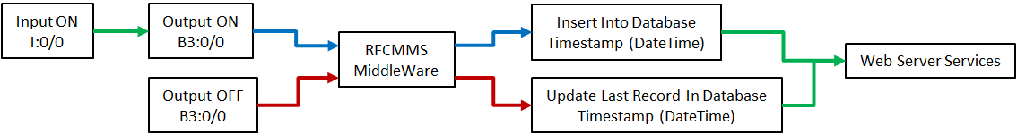 | When the middleware detects the output of the PLC is ON, the middleware inserts a new record into MySQL database. When the middleware detects the output is OFF, the middleware updates the previous data it inserted with new data to indicate the input is off. |