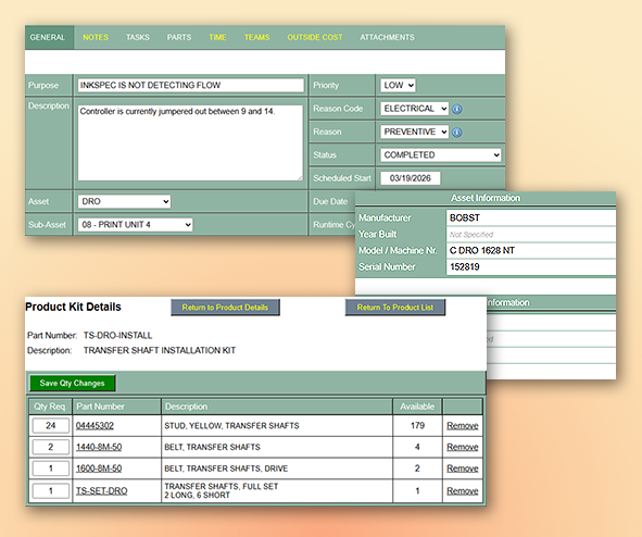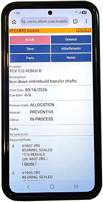 95% of the work order features are available on the phone app. Create and close a work order, recording your labor hours, take pictures or video, make notes, look up inventory and record consumable product usage.