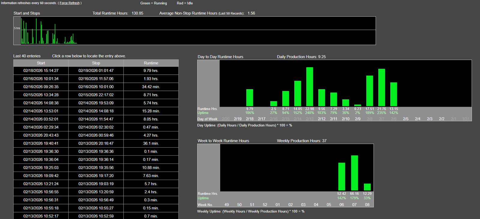 With the RFCMMS Middleware application, you can get the live starts and stops of your machines. To learn more about this feature, select the link to the left for more information. A report has been created to show "Starts and Stops", Total Runtime, Daily Runtime, Weekly Runtime, Average Runtime and what other machines are currently running. This report helps to make informed scheduling decisions.