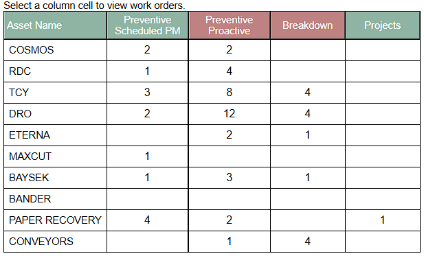 | Below is the results of this type of filtering. The goal is to never see breakdowns having a higher number than preventive. If you see breakdowns adding up like in the "Conveyors", you need to see how to change processes, add procedures or upgrade equipment to reduce the breakdowns. |
